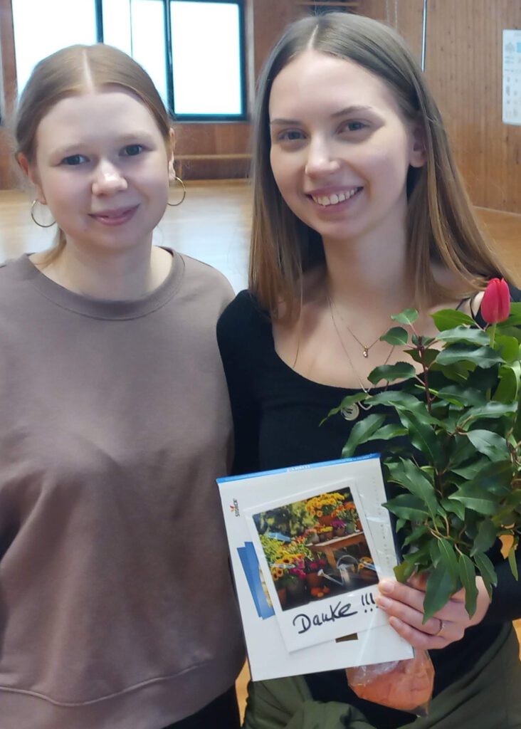 Die Übungszeiten unserer Gruppen sind folgende: DanceMinis (ab 4 Jahre) donnerstags 15.45 Uhr, KidsDance1 (ab 6 Jahre) donnerstags 16.30 Uhr, KidsDance2 (ab 9 Jahre) freitags 15.45 Uhr, Kids(Teens)Dance3 (ab 12 Jahre) freitags 16.45 Uhr. Am Donnerstag wird Josy als Übungsleiterin von Leana unterstützt.